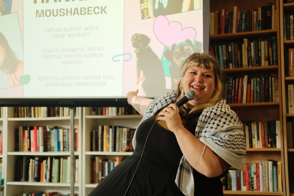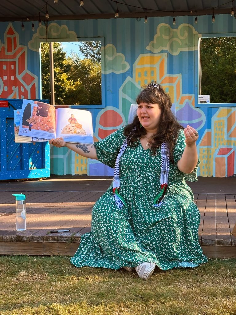 Hannah Moushabeck is a queer Palestinian-American award-winning storyteller, book and culture worker. With over fifteen years in the book industry, she is an engaging speaker for groups of all ages, from the youngest readers to college students or parents, and educators.